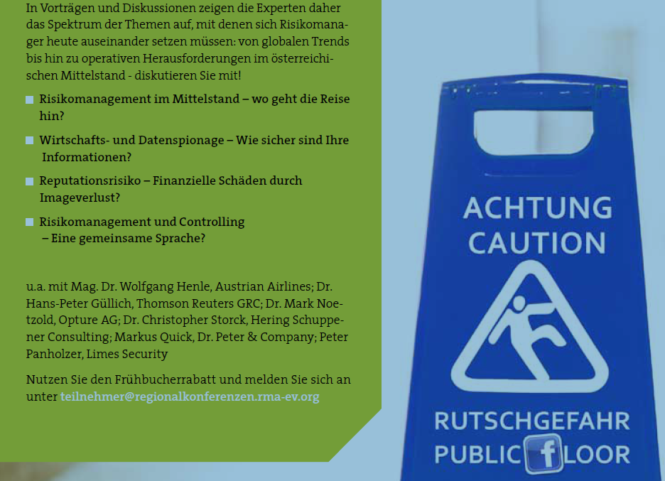 Treffen Sie unsere Experten auf der nächsten RMA-Regionalkonferenz am 20. November 2013 in Wien. Mehr Informationen zur Agenda und den Referenten finden Sie hier. Themenüberblick: Risikomanagement und Risikocontrolling – Eine gemeinsame Sprache? Wirtschafts-und Datenspionage –Wo sind die Schwachstellen? Reputationsrisiko – Finanzielle Schäden durch Imageverlust? Risikomanagement im Mittelstand – Wo geht […]